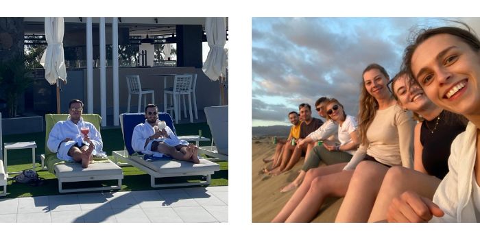 Unsere Unterkunft, eine tolle Anlage mit Infinity Pool und modernen Apartments, bot nicht nur den perfekten Rahmen für unsere Arbeit, sondern war auch für gemeinsame Abende bestens geeignet. Es wurde zusammen gekocht, auf der Terrasse Karten gespielt oder wir haben einfach mit ein paar kalten Getränken den Abend gemütlich ausklingen lassen. Für die letzten Sonnenstrahlen ging es oft noch in den benachbarten Beach Club. An manchen Abenden sind wir auch gemeinsam essen gegangen oder mit unseren Mietwagen ins 10 Minuten entfernte Maspalomas gefahren und haben dort den Sonnenuntergang in den Dünen bestaunt.